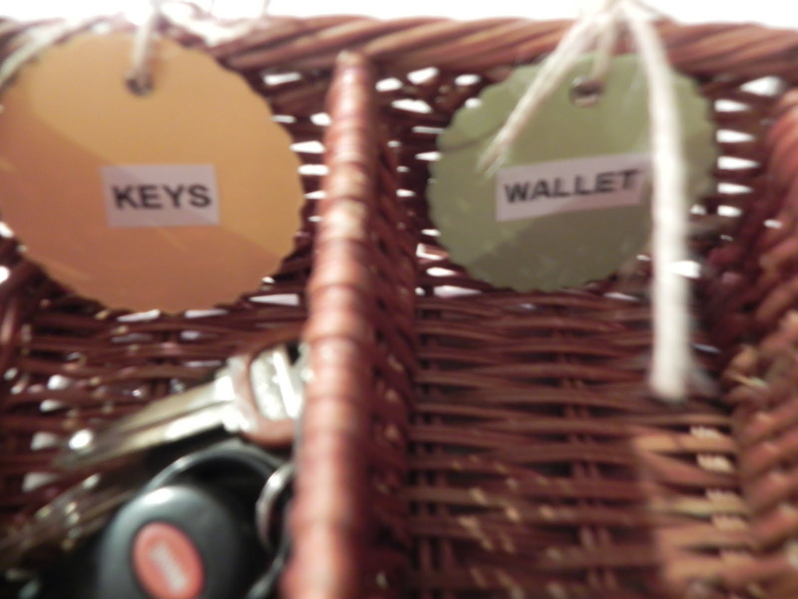 I got those cute tags from Target's dollar spot a while back. I used my labeler and printed labels for the following: Keys, Wallet, Glasses, Phone, and Change.