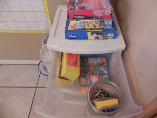 These are our morning and quiet time drawers. It hold crayons, stencils, tic tac toe. These are only allowed in the kitchen.